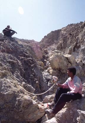 Theoderos Tesfai, an Eritrean geochemist, collects a sample of fumarolic gas at As'ela, a fumarole on Alid's north flank. He is watched by a local goatherder. Fumaroles are found at about ten sites in the summit depression and north flank of Alid. The ground surface contains efflorescent salts such as alum, a hydrated potassium sulfate, tschermigite, a hydrated ammonium sulfate, gypsum and clays such as illite and montmorillonite. The fumaroles emit steam as well as about 5% other gases such as carbon dioxide, hydrogen, hydrogen sulfide, nitrogen, and ammonia.