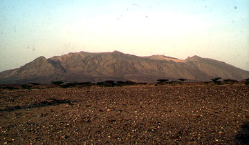 View of Alid volcanic center from the west, across alluvial pediment shed from the Precambrian Eritrean highlands. Alid is a structural dome and rhyolitic volcanic center that rises about 700 m from the floor of the Danakil Depression, an actively spreading graben that extends north from the Afar triple junction. The summit of Alid is 910 masl. |