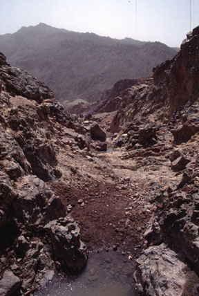 An acid thermal pool, about 1 meter across, at Ilegedi. Water in these pools varies from the ambient air temperature (~30-40°C) to over 80°C, due to mixing with the hot fumarolic condensate. Ilegedi is in a short N-S valley just east of the eastern edge of the summit depression. It is the major water source on Alid and is used by humans and their stock (camels, goats and burros) as well wildlife such as birds and babboons. |