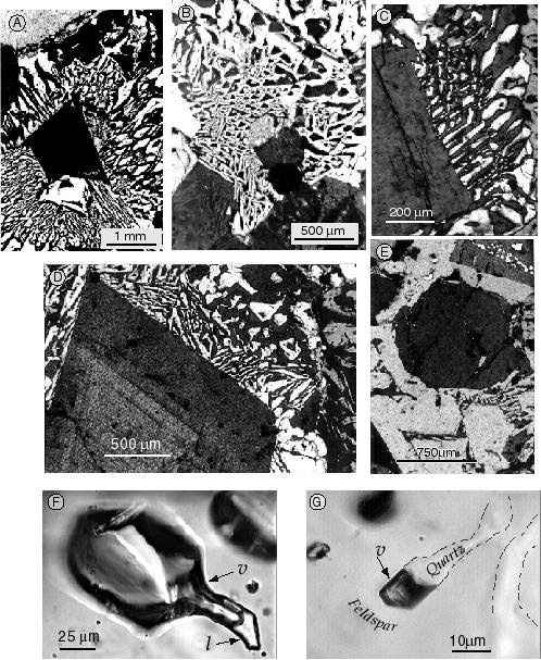 Photomicrographs of areas within granophyric block found as a lithic in the "pf unit" at Alid volcanic center. Figure parts a-e with crossed nichols. (a) Micrographic groundmass surrounds feldspar phenocryst fragment. (b) Micrographic groundmass around clinopyroxene phenocryst. Quartz is white and feldspar is at extinction. (c, d) Radiating fringe of feldspar in groundmass is in optical continuity with phenocryst, from which it nucleated. (e) Quartz phenocryst is surrounded by feldspar groundmass. Quartz in groundmass does not appear to have nucleated directly on phenocryst, but is in optical continuity with it. (f) Primary vapor-rich fluid inclusion in phenocrystic quartz. Liquid (l) is seen at the bottom right, the rest being vapor (v). (g) Primary vapor-rich inclusion at the tip of a quartz stringer (outlined for clarity) in the granophyric groundmass.