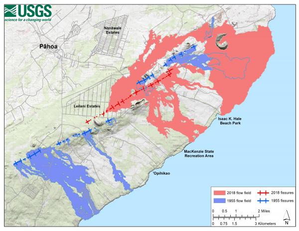 The 1955 lava flows covered about 15.8 sq km (6.1 square miles) of land, burying around 10.1 km (6.3 mi) of roads and destroying 21 homes. In 2018, lava flows covered about 35.5 sq km (13.7 square miles) of land, burying 48.3 km (30 mi) of roads and destroying 723 structures.