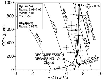 Saturation plots such as Fig. 8 were first used by Anderson et al. (1989) and Skirius (1990), who measured H2O and CO2 concentrations in MI from the Bishop tuff and found that their compositions were consistent with isobaric, vapor-saturated crystallization prior to eruption (similar trend shown on Fig.8). Wallace et al. (1994) plotted CO2 versus the incompatible element U to calculate the amount of isobaric fluid-saturated crystallization prior to eruption of the Bishop tuff. This allowed them to estimate the mass of exsolved fluid in the pre-eruptive magma chamber. For the 1991 Pinatubo eruption, Wallace & Gerlach (1994) analyzed MI and found that the amounts of dissolved H2O and CO2 were sufficiently high that the magma had to crystallize at pressures � 250 MPa. This pressure agrees with that estimated for the Pinatubo magma reservoir by a variety of experimental, geophysical, and mineralogical criteria (Gerlach et al., accepted).