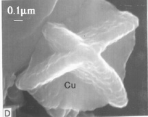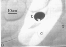 FIG. 9. Features within vapor bubble in a single pantellerite MI (from Lowenstern et al. 1991). (A) Transmitted-light photomicrograph of a large bubble (b) within pantellerite glass inclusion (g) in quartz (q). The sample surface is mottled due to the Ar-ion milling technique used to expose the bubble to air. (B) Bubble, now exposed, as imaged by backscattered-electron imaging. The glass is lighter in color because its mean atomic weight is higher than the quartz. Note the bright speck within the bubble. (C) Copper- (Cu) and Cl- (h) rich mineralization within the bubble, as seen by secondary-electron imaging. (D) Close-up of the Cu-mineralization within vapor bubble. Lowenstern et al. (1991) used a variety of criteria to interpret that the Cu-rich bubbles formed by heterogeneous entrapment of pantellerite melt and a Cu-bearing volatile phase (see text).