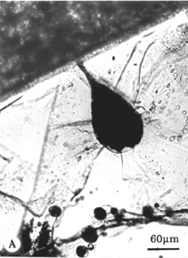 (D) Hourglass MI from the Valenza unit at Pantelleria (Lowenstern & Mahood 1991). Large bubble within remelted MI sits at end of long, thin capillary (arrows) that extends to crystal surface. Bright spots below bubble are other MI, out of focus beneath the inclusion of interest. Bright spot northeast of bubble is a refractory quartz bleb (Lowenstern 1994a).