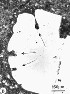 Transmitted-light photomicrograph of plagioclase from pumice fallout deposited during the climactic eruption of Mt. Mazama/ Crater Lake (from Bacon et al.; 1992). The dark MI are along zonal arrays, just outside of patchy zones that may be formed during resorption events. The elongate MI is 70 x 130 µm.