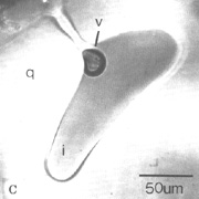 (A) Crystallized hourglass inclusion from the Pine Grove porphyry, Utah. Small capillary connects the bulk of the inclusion with the outside of the host crystal. (B) Hourglass inclusions form a continuum with simple reentrants, as illustrated by three hourglass/reentrants (arrows) in quartz grain from Pine Grove porphyry. (C) Glassy hourglass inclusion (i) in quartz (q) contains a large bubble (v) grown at inclusion end of capillary (from 1912 rhyolite erupted at Valley of 10,000 Smokes, Alaska; Lowenstern 1993).