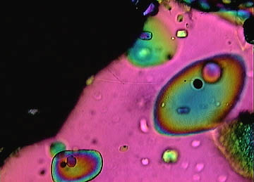 Transmitted-light photomicrograph of plagioclase from pumice fallout deposited during the climactic eruption of Mt. Mazama/ Crater Lake (from Bacon et al.; 1992). The dark MI are along zonal arrays, just outside of patchy zones that may be formed during resorption events. The MI is 90 x 120 µm.
